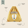 The floppy ears provide a nice playful detail. Use the 2 handy drawstrings to easily open and close the gym bag. There are a name tag and a small pocket inside; the latter to keep some small items, money or a membership card.